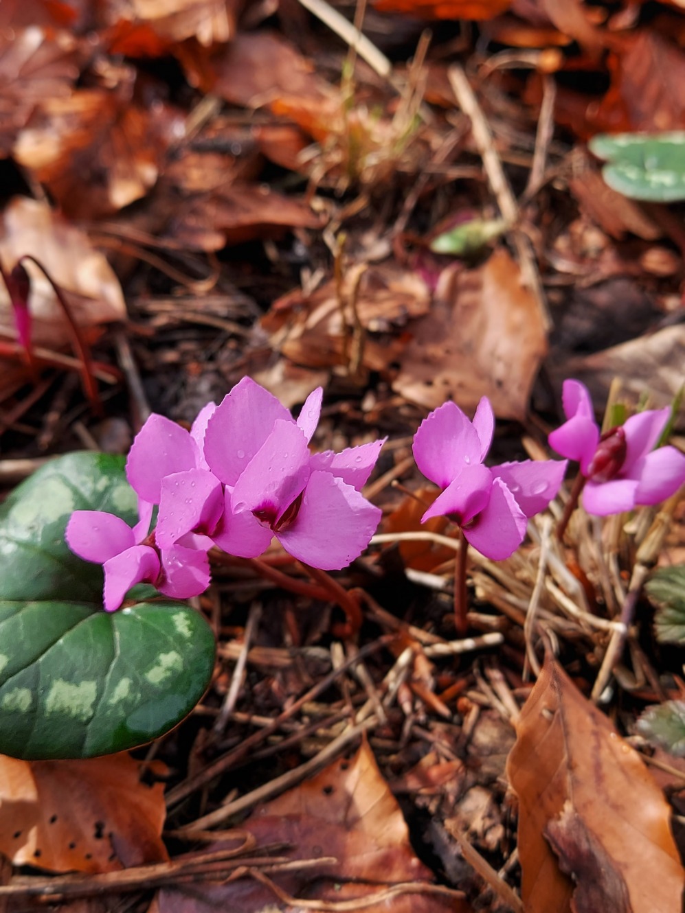 Diese Gruppe namens, "Kos-Alpenveilchen" (Cyclamen coum) Entdeckte ich am Irchel- Es ist anzunehmen, dass diese "eingebracht" wurden. Nichts desto trotz sind sie wunderschön anzusehen.