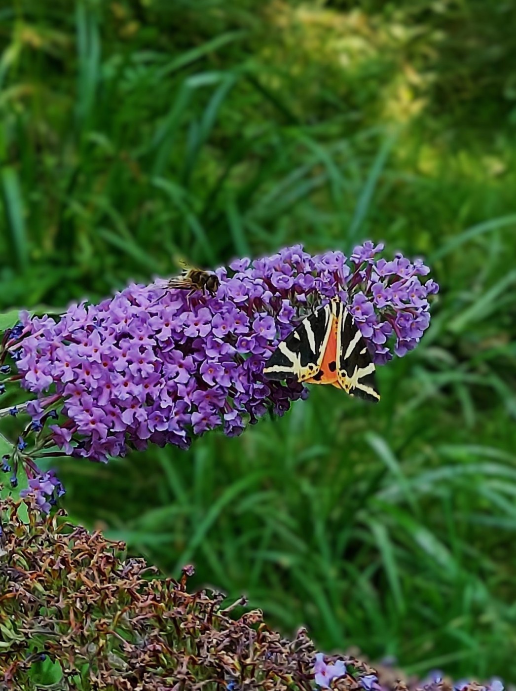 Wieder zurück in unsere Gefilden, in einem sehr unwegsamen Gebiet des Irchels, traf ich auf diesen Schmetterling "Russischer Bär" und (Wahrscheinlich) eine Schwebfliege auf dem "Schmetterlingsflieder"