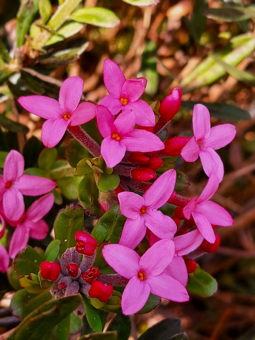Eine wunderschöne Gruppe "Flaumiger Seidelbast" (Daphne cneorum) bei Eglisau (Eglisgrund).