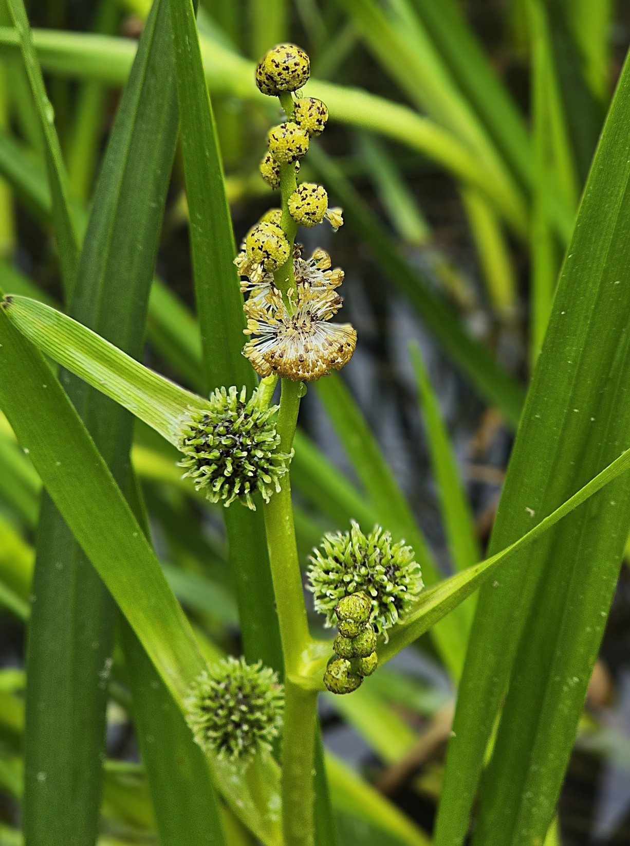 Ästiger Igelkolben (Sparganium erectum). Blütezeit: Juni - August